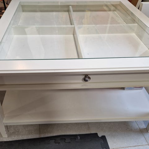 Bord, glasskiva med, målad träram, 100 ggr 100 cm, höjd 50 cm. 400 kr