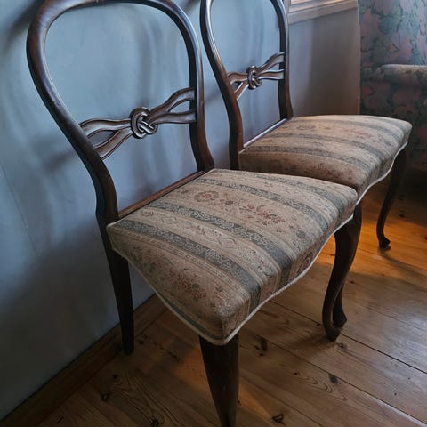 Stolarna är äldre modell och med dynor, kan behöva en tvätt eller omklädnad. Stabila och rejäla stolar.
