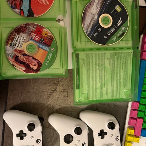 Xbox one med två kontroller och fyra spel