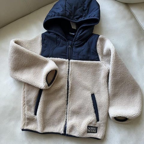 Jättesött set med en randig jacka och matchande mössa i marinblått/vitt. Jackan/jacktröjan har varmt pilefoder, fickor fram och avtagbar huva. Mössan är en klassiker i skön bomull, stl 48/50.