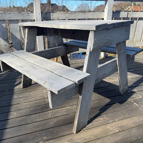 Fint mjölkbord för trädgården. Behöver målas eller impregneras.