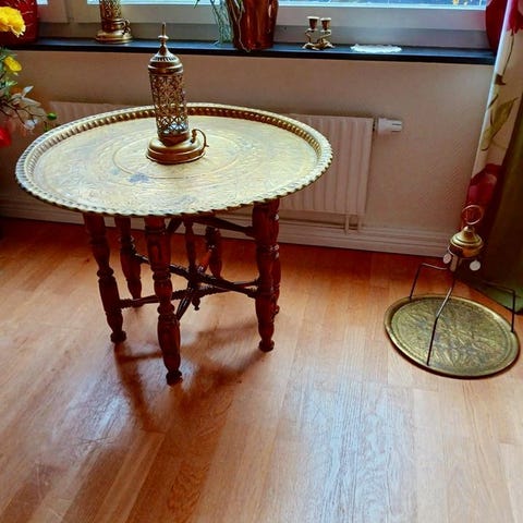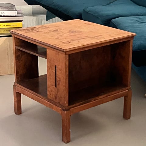 Fint rökbord i Art Deco stil. Glasskiva på toppen. 2 lådor, två skåp med dörrar, 4 öppna hyllor.