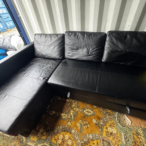 Mio Skaftö bäddsoffa med 3 sittplatser och schäslong i grått tyg. Materialet är textil och soffan är designad för vardagsrumsmiljöer. Förvaring i soffan finns. Små fläckar på nedre delen av soffan- se bild. Annars sparsamt använd. Inga djur i hemmet.