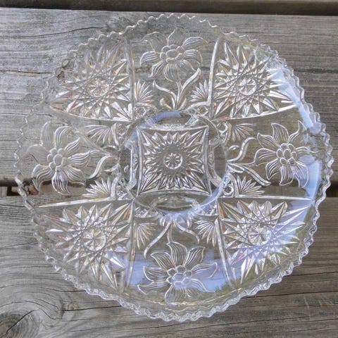 Säljer ett fint set med Orrefors pressglas i klassisk blom-/växtdekor.