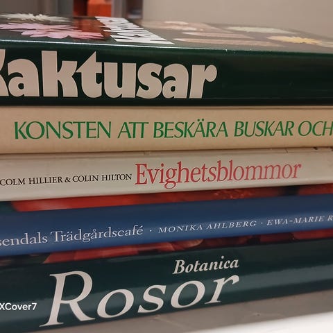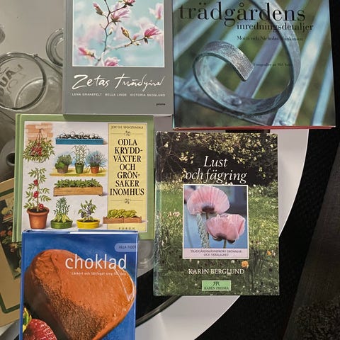 Böcker om trädgård, självhushållning, biodling, odling och jordvård. 150:-/st eller 500:- för alla sex.
