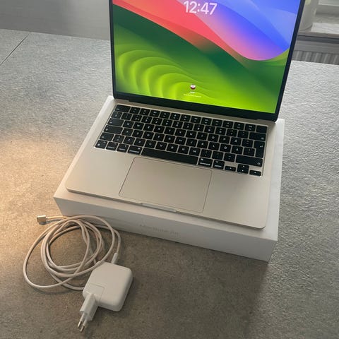 Apple MacBook Air laptop med tunn och lätt design i silverfärg. Utrustad med en högupplöst skärm och olika anslutningsmöjligheter. Passar för allmänt bruk och mobil datoranvändning.