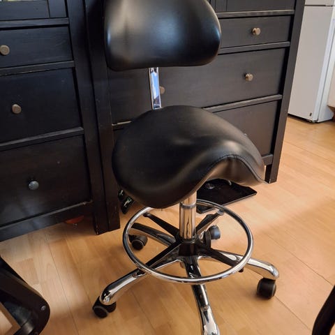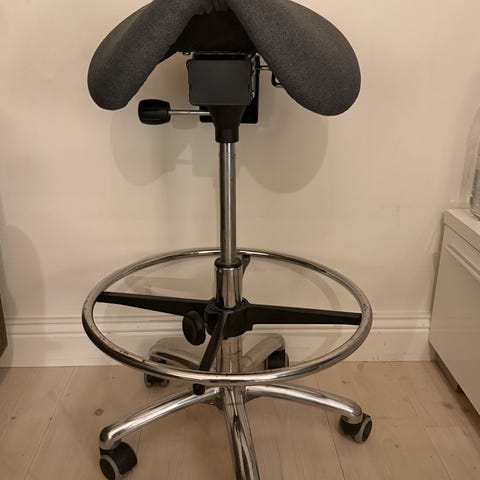 Sadelstolen Dalton från Global Stole är en sadelstol med klassisk cowboysits. Sittpositionen ser till att ryggen behåller sin naturliga kurva och därmed minskar spänningar. Blodcirkulationen förbättras eftersom man sitter med relativt "öppna" vinklar på höft- och knäleder. Med sitsmekanismen Euromatic får man en steglös justering av sittvinkeln på 12° framåt och 3° bakåt, och en ryggstödsvinkel på 16° framåt och 6° bakåt. Läs mer i bifogad länk. Nypris ca 7000 kr.