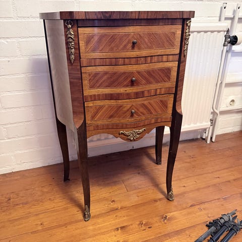 Stabil möbel i gott skick för sin ålder med fin patina. Flera lådor samt öppet hyllplan nedtill.
