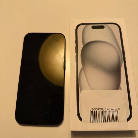 iPhone 15 mobiltelefon med 128 GB lagringsutrymme i svart färg. levereras i originalförpackning.