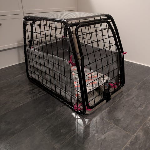 Metallbur för hundar med gallerdesign och plastgolv. Burens konstruktion ger ventilation och stabilitet, lämplig för transport eller säker plats för hundar.