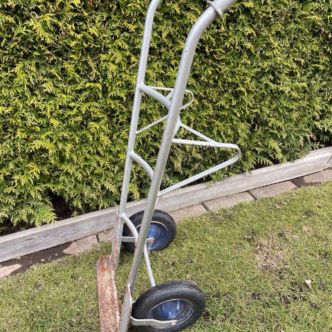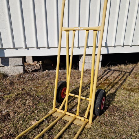 Varuvagn med hjul och handtag i metall. Vagnen är orangefärgad med synliga tecken på användning och slitage. Den har två hjul och en plattform för last. Handtagen är utrustade med plastgrepp.