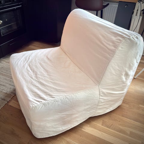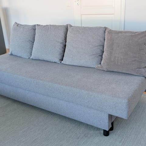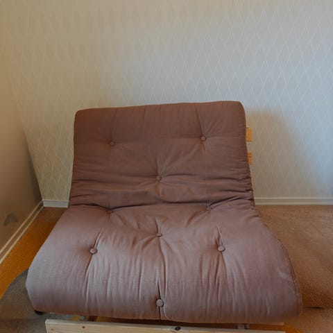 Grå bäddfåtölj säljes. Fint skick förutom en fläck på dynan, inringad på bild. Därav det låga priset!