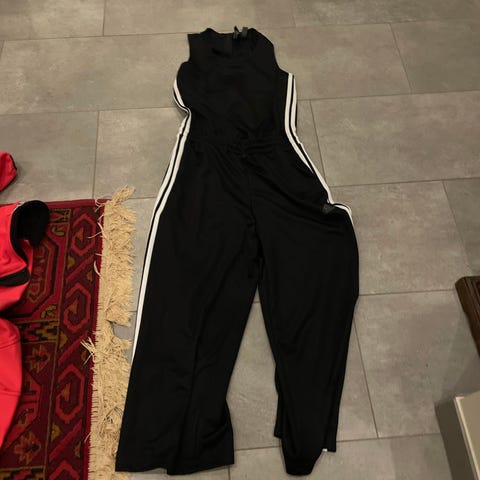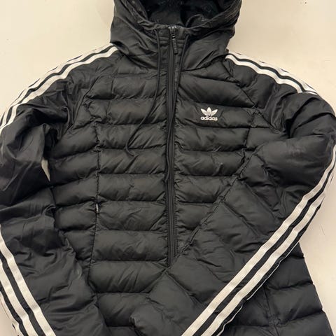 Svart Adidas tröja med vita ränder på ärmarna och Adidas loggan både fram och bak. Jackan har tryckknappar och dragkedja fram. Storlek S oversize dam. Kan skickas eller hämtas i Rissne Sundbyberg.