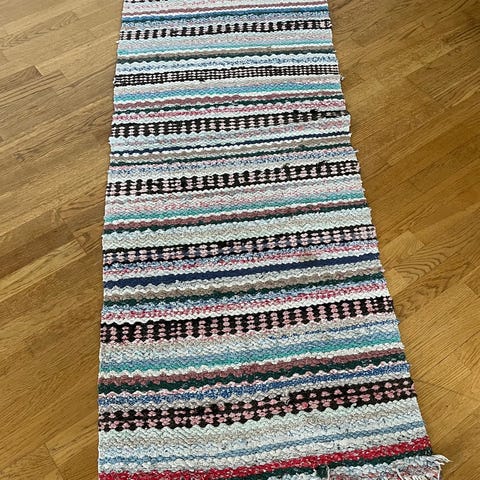 Är i fint använt skick. Är tvättad men det förekommer fortfarande svaga fläcka på den beige randiga delen (den sidan av mattan som jag själv har använt) Se bild.2