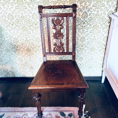 Antik stol tillverkad i trä med en sits av rotting. Stolen har en dekorativ ryggstöd och är lämplig för användning som sittmöbel i hem eller kontor.