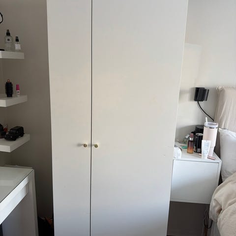 IKEA garderob med flera lådor och hyllor i vitt.