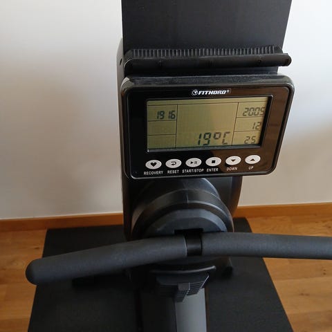 FitNord Oceans 200 roddmaskin med digital display för tid, distans och kaloriförbrukning. Maskinen har justerbara fotplattor och sittdyna för komfort under träning. Passar för hemmabruk och konditionsträning.