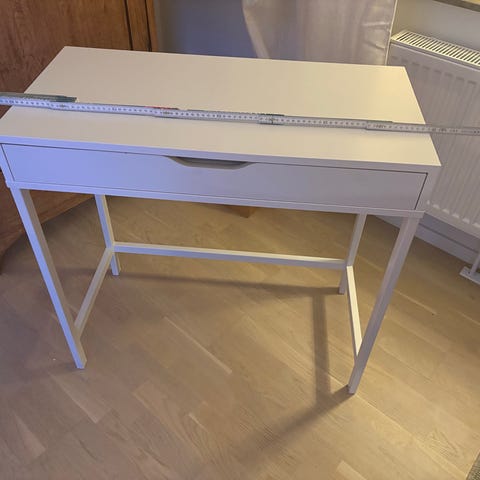 IKEA skrivbord i vitt med en låda där man kan förskjuta facket fram och tillbaka. Upphöjda kanter på bordsytan. Skrivbordet har en rund kabelgenomföring och är tillverkat av material som är lämpliga för hemmakontor eller studier.