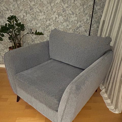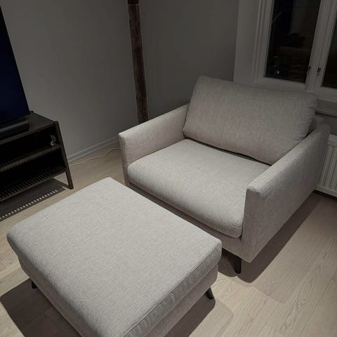 Fåtölj med fotpall. Steglös glide-funktion i fåtöljen. Nypris: 6495kr Nu 2000kr