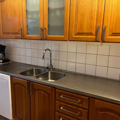 Inbyggt köksskåp med snabelhandtag, rostfria. Krokar för kaffekoppar i överskåpet, bredd 109 cm, djup 38 cm, höjd underskåp 70 cm, höjd överskåp ca 100 cm, monteras ner av köparen på plats.