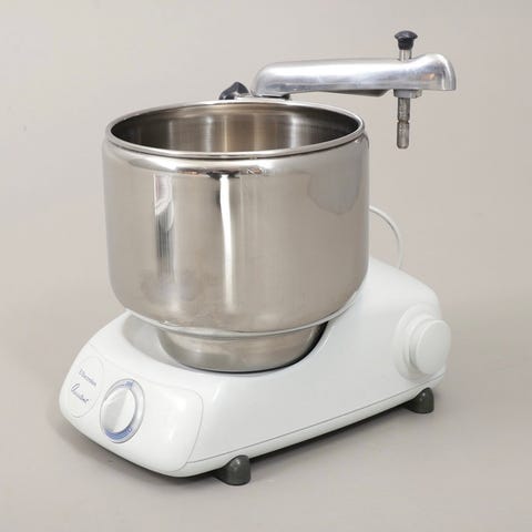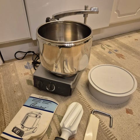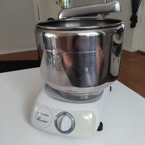 Mycket sparsamt använd. Bra skick. Snygg färg i lila. Gör underbara degar för bröd. Säljes pga uppdatering då vi behövde en större modell. Allt du behöver finns med. En extra köttkvarn medföljer på köpet.
