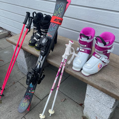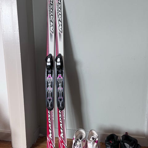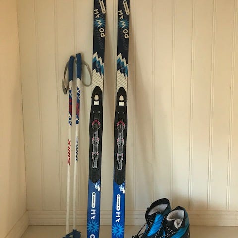 Längdskidor Rossignol som är vallningsfria för de allra minsta. Passande tillhörande varma pjäxor i storlek 26 och 30. Stavar följer med.