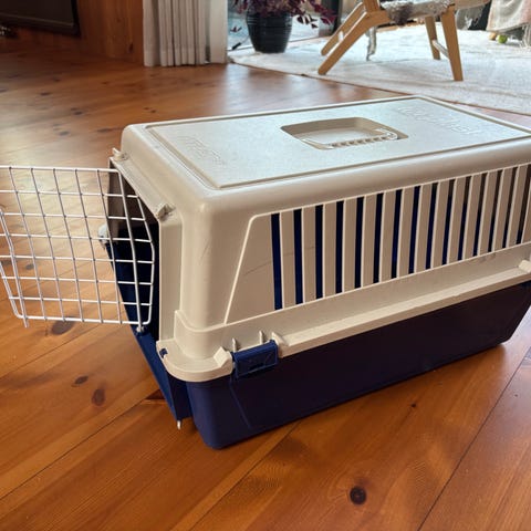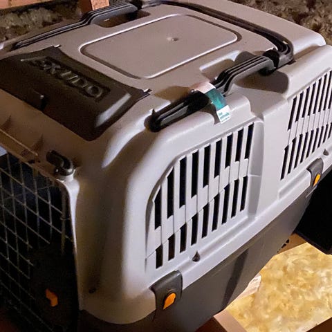 Finns ett spänne i buren som man kan sätta fast i halsband/koppel.