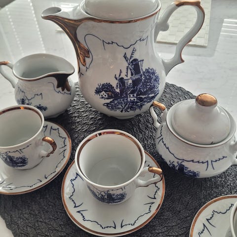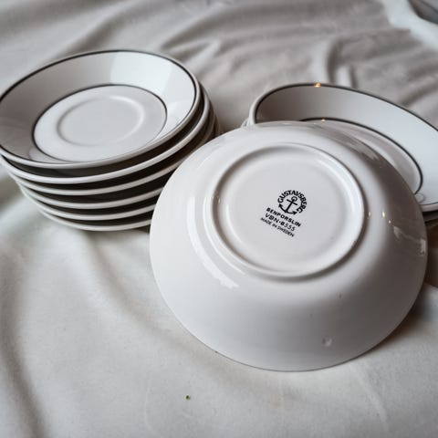 Gustavsberg servis ”Rosa” i benporslin bestående av 7st koppar och 9st fat. Designer Margareta Hennix.