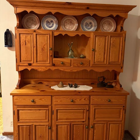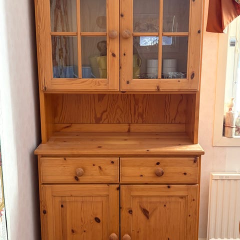 Furuskåp med vitrindel, skåp och lådor.