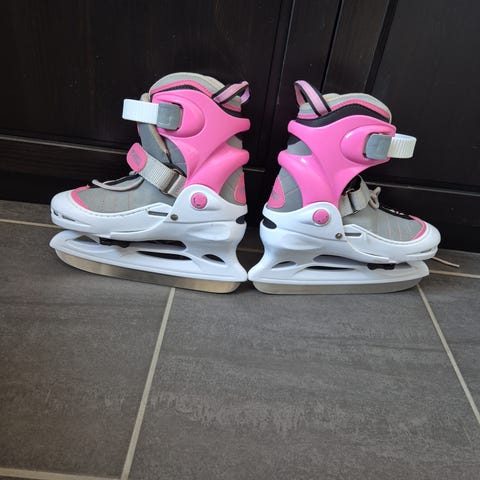 Barnskridskor i storlek 30-33 med vit och rosa färg. Passar för ishockeyskridskor.