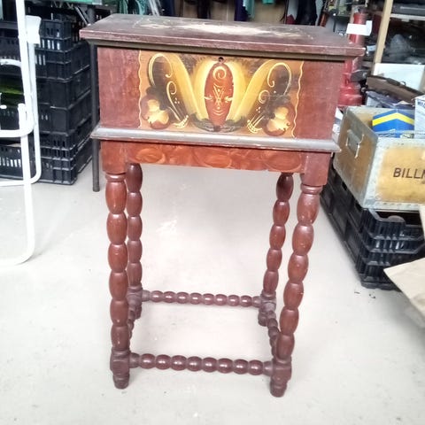 Rött träskåp med en dörr och en hylla inuti. Skåpet har dekorativa detaljer på sidorna och är målat i rött. Pottskåp