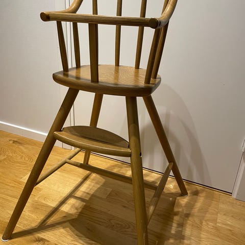 Kinderkraft Enock matstol i trä med justerbar sits och fotstöd. Passar barn från 6 månader upp till 15 kg. Stolens design möjliggör flera sittpositioner och anpassning efter barnets behov.