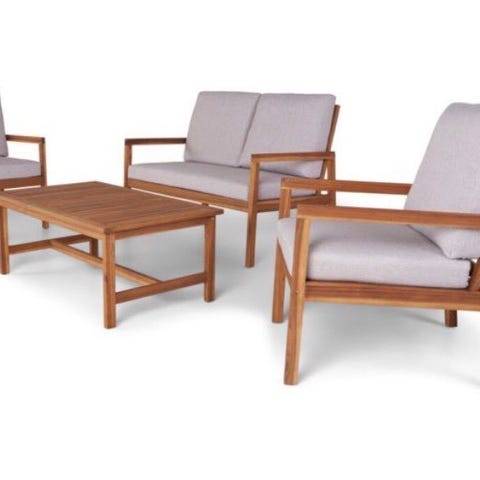 Trädgårdsmöbelset bestående av fåtöljer, soffa och bord i trä med beigea dynor. Möbelsetet är utformat för utomhusbruk och passar till balkong eller uteplats. Dynorna är avtagbara och ger komfort vid sittande.