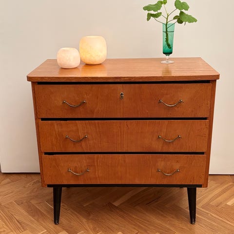 Handtag och nycklar saknas. Perfekt för den som vill fixa till en byrå eller ändå tänkt byta handtagen.