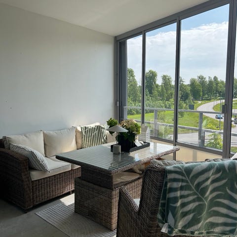 Utemöbelset bestående av hörnsoffa och bord i svart rottingmaterial. Soffan har dynor för sittkomfort och bordet har glasskiva. Passar för utomhusbruk på terrass eller balkong. Tog bara kort på två av fyra dynor - resterande är likadana och fyller precis ut soffan.