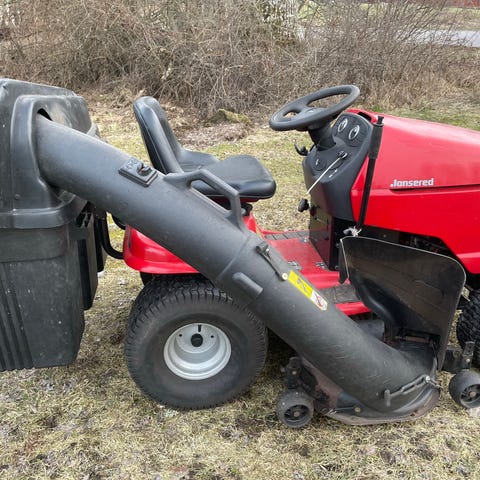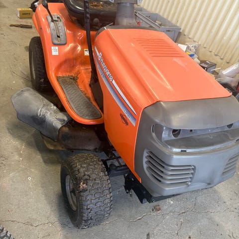 Fungerande åkgräsklippare, röd. Lite dammig men i ok skick, årsmodell okänt.