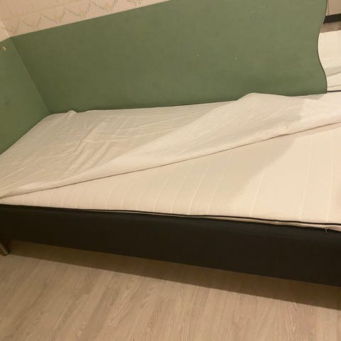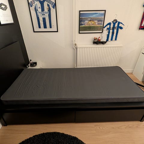 Säng med träram 105 cm från Wiking beds i fint skick. Komplett med sängram och bäddmadrass. Grå sängkappa kan ingå utan kostnad om man vill