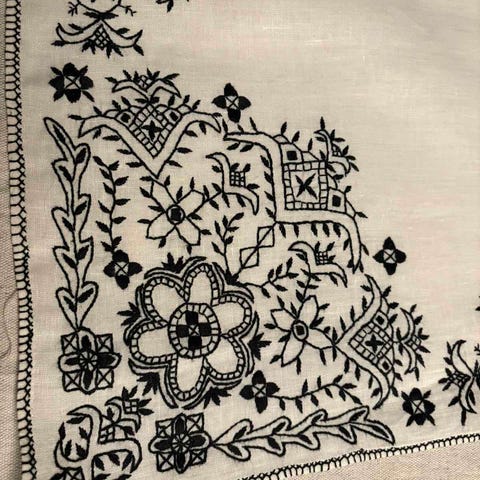 Svart och vit schal med mönster i rutform och fransar på kanterna.