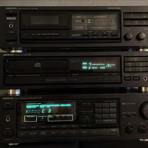 Utrustningen är äldre men spelar riktigt bra med fylligt, stabilt ljud och bra tryck i basen. Perfekt som stereoanläggning eller till TV via optisk/coax.