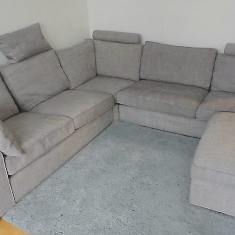 Mått: Ena längden ca 305 cm, andra längden ca 240 cm. Djup ca 105 cm, Höjd ca 80 cm och sitthöjd ca 40 cm.