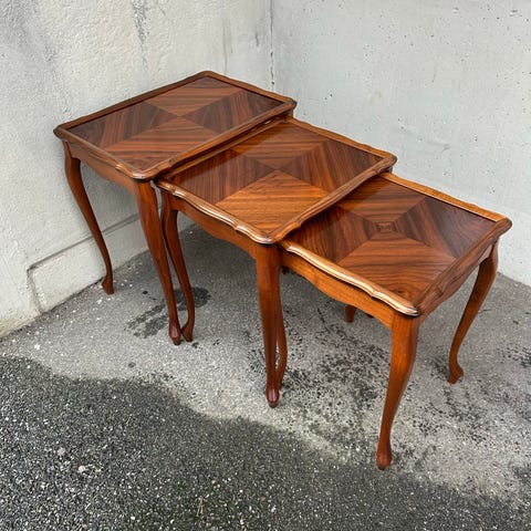 Three set table satsbord tillverkat av rostfritt stål i polerad mässing med skivor av härdat klarglas. Med klassisk touch och art deco-känsla har detta satsbord allt du kan begära. Det är tidlöst och kommer alltid att vara uppdaterat.