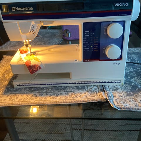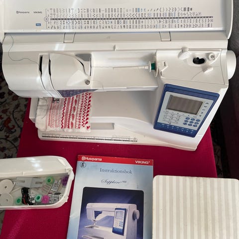 Husqvarna CL 21 A symaskin i grön färg med metallkonstruktion. Maskinen har flera stygnmönster och mekaniska rattar för inställningar. Levereras med tillbehör som fotpedal och trådrullar. Passar för olika sömnadsprojekt.ny servad fungerar klockrent med alla tillbehör och jätte kraftigt symaskin sy kapell skinn jeans häst täcke elastisk mm
