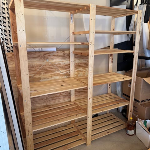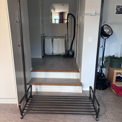 Två stycken Stolmen låd- och hyllsystem (till höger på första bilden) och Elvarli (till vänster) med klädstång och hyllplan för skoförvaring säljs. Mindre märken finns men ingenting som påverkar funktionen.