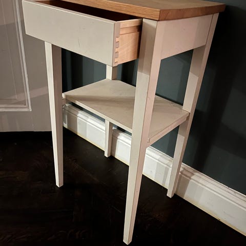 Furuhyllplan inmålade i grundnyans ljusgrå, samma nyans som konsoler och min dåvarande vägg :)
