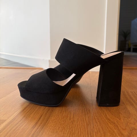 Svarta tyg skor med en knytning runt ankel I form av en blomma.