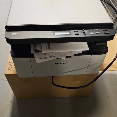 Svartvit skrivare med i stort sett fullt magasin, original Brother TN-2410. Fungerar perfekt