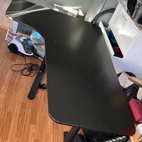 IKEA hörnskrivbord i vitt med enkel design. Bordet är anpassat för hörnplacering och har en yta som ger plats för arbete eller studier. Passar för hemmakontor eller arbetsrum. 90x90cm