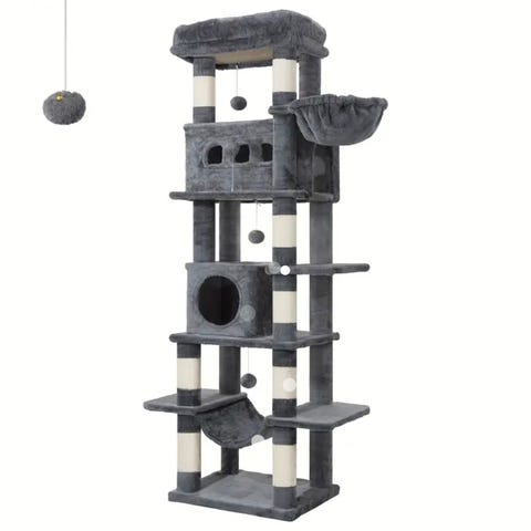 Klösträdet har flera plattformar i olika nivåer, hängmatta samt hängande boll för lek. Ger katten möjlighet att klättra, vila, leka och klösa på ett och samma ställe. Stabil bas som gör att det står stadigt.