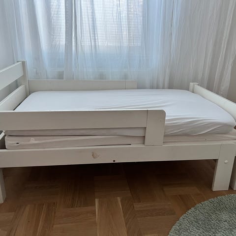 Fin säng från Hoppekids i gott skick. Sängen är svanenmärkt och i massiv furu. Madrass och sängkantsskydd ingår. Madrassmått: 70x160 cm Sängmått: L166 x H65 x D75 cm Mått under säng: H23 cm