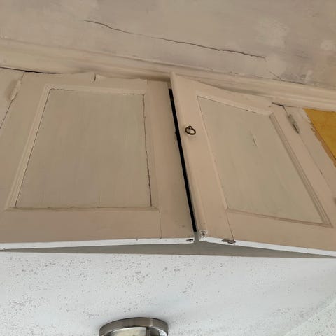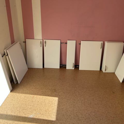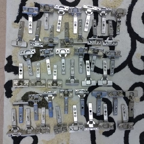 Dubbla gångjärn på alla luckor och skåpdörren finns till alla gångjärn, tom skruvar ingår. Färgrester på gångjärnen. Står IngewallKöket på gångjärnen.